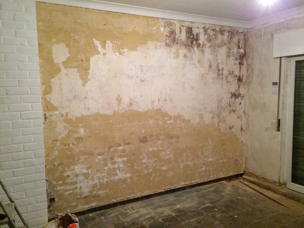 Par contre pour retirer ces feuilles de plomb : c’est la merdasse. Oubliez le fait de tremper à l’eau chaude : ça n’aide en rien ; tandis que gratter a pour résultat d’arracher une partie du plafonnage. J’ai lu qu’on conseillait d’utiliser un décapeur thermique pour faire fondre la colle et d’arracher ensuite. Vu le risque de vapeur toxique et mon manque d’équipement en la matière, j’ai finalement opté (abandonné, avouons-le) pour la solution de recouvrement après avoir arraché une bonne couche de plafonnage malgré tout. Le mur peut donc respirer un peu et ça ne lui a pas fait de mal au vu de ce qui est ressorti pendant les premiers jours à nu.