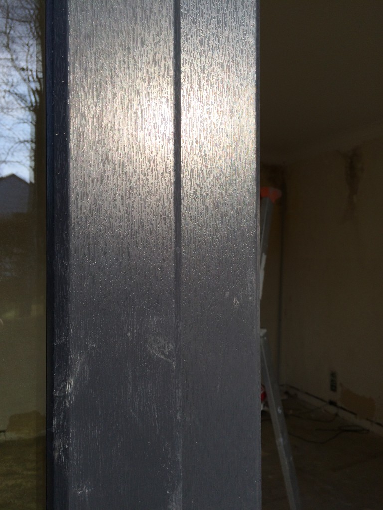 J’ai opté pour des châssis en PVC anthracite structuré à l’extérieur et blanc lisse à l’intérieur (Uw = 1,39), parés de doubles vitrages basse-émissivité (Ug = 1,1) feuilletés, avec gaz et espaceur à coupure thermique. Pour les fenêtres à ouvertures, j’ai opté pour des cylindres de sécurité (arrachage et forage) et un barillet à multiples points d’ancrage pour la porte d’entrée, également remplacée.