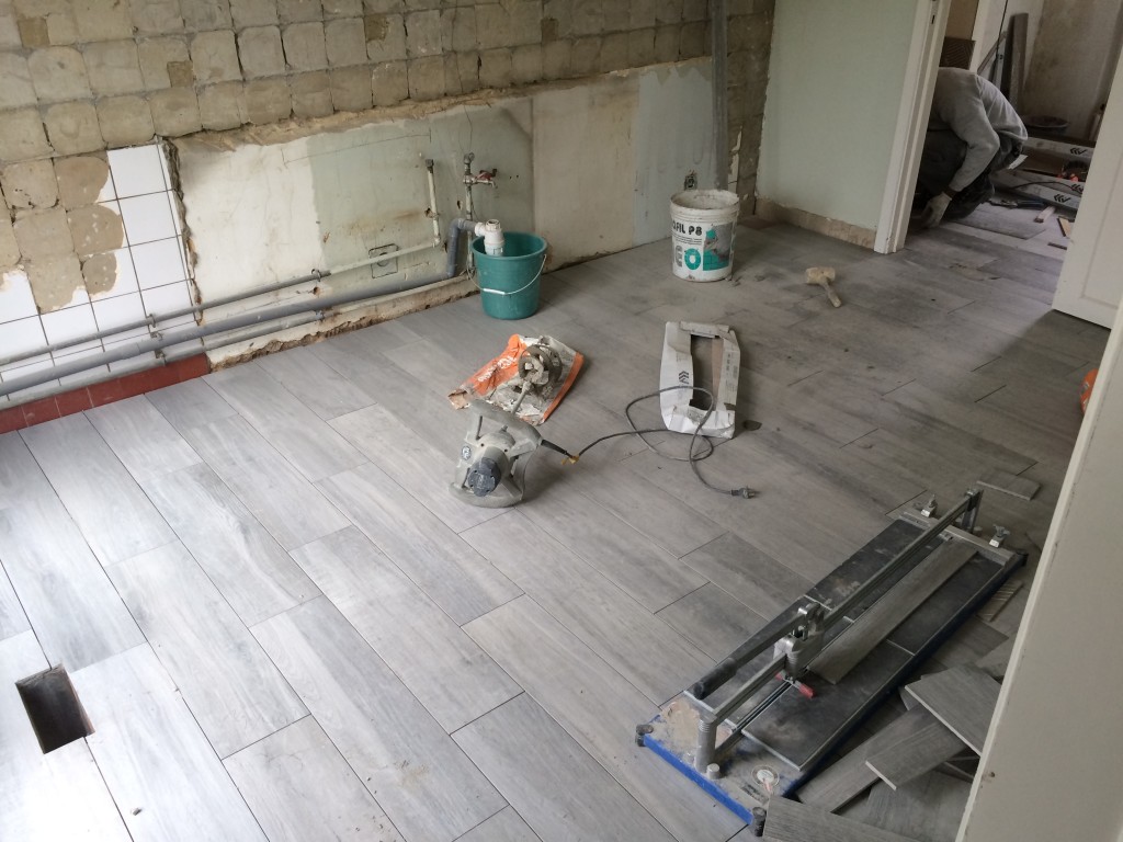 Les anciens sols n’étant pas très droit et parfois fissurés, il a fallu un travail préparatoire de démolition à certains endroits (salon, cuisine) afin de faciliter le travail de l’équipe de carreleur (qui a été finalement seul pour toute la semaine de travail). Heureusement, je n’ai pas du tout enlevé ! Le burin, c’est sympa 10 minutes…