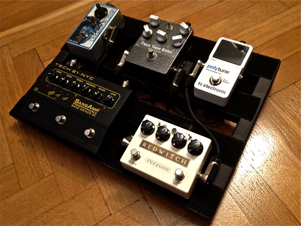 On retrouve un accordeur TC Electronic Polytune, une Redfuzz God War II, mon inséparable Tech21 SansAmp (je suis juste passé de la version normale à la version deluxe, mais cette pédale me suit presque depuis mes débuts à la 4 cordes.).