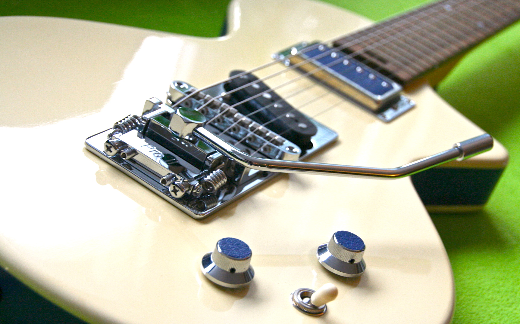 Concernant le vibrato Stetsbar : s’il ne s’agit pas là de mon système de vibrato préféré (Bigsby forever !), j’affirme volontiers qu’il fait bien le job (bien qu’un peu sensible à mon goût) et s’adapte esthétiquement de manière très harmonieuse à la guitare.