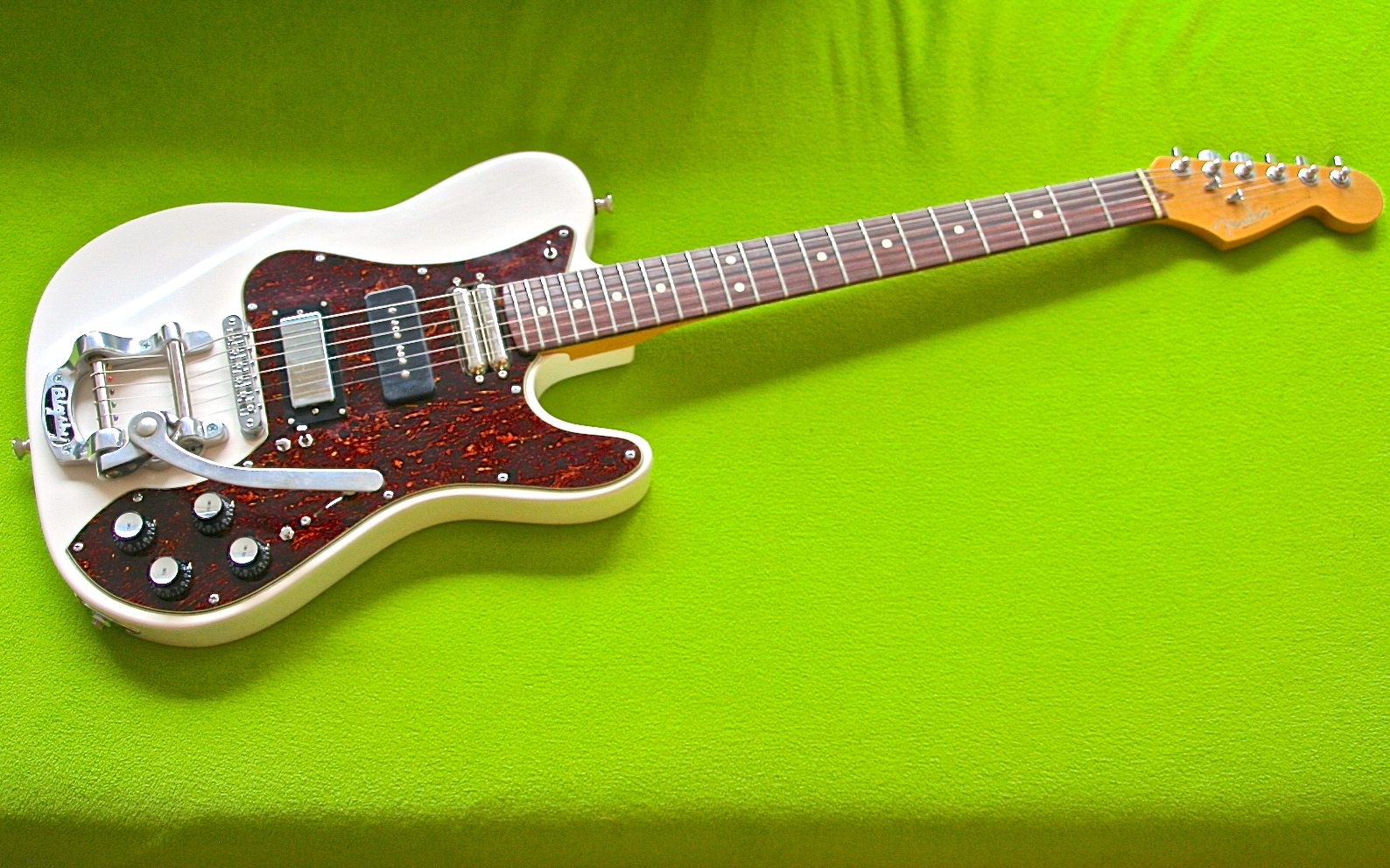 – pickguard combinant les formes de Strat (sur le haut), Telecaster Standard (la corne) et Tele Custom (au niveau des potards),