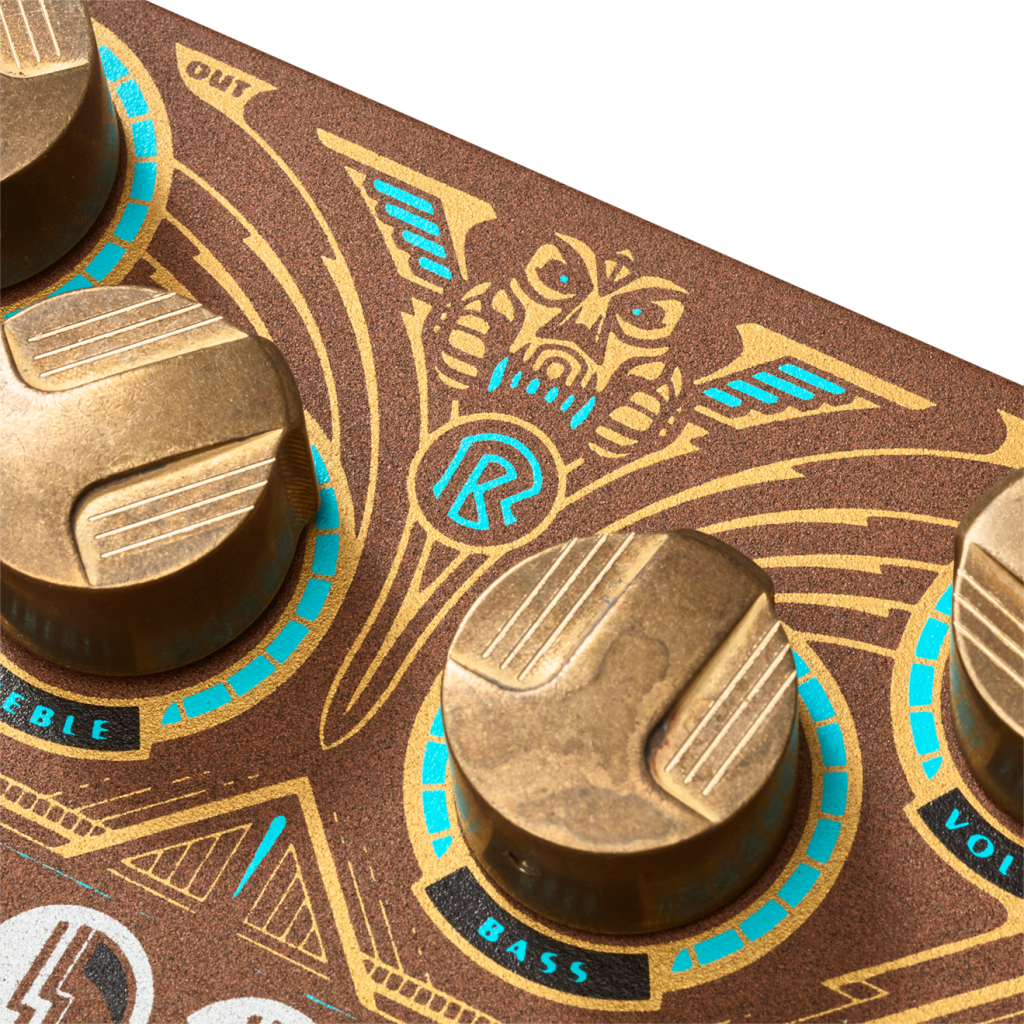 Le deuxième footswitch actionne l’Octavia Fuzz qui se contrôle sur le côté droit de la pédale grâce à 1 potard de Volume latéral et un toggle switch avec 2 positions de Gain différent.