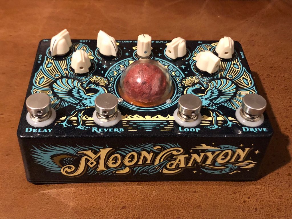 J’ai le plaisir de vous présenter la magnifique Moon Canyon, une triple pédale du déjanté fabricant néerlandais Dr.No. Un véritable travail d’orfèvre qui vient sublimer esthétiquement un concept simple et efficace : un assemblage de 3 effets réputés dans un seul boitier, avec quelques twists.
