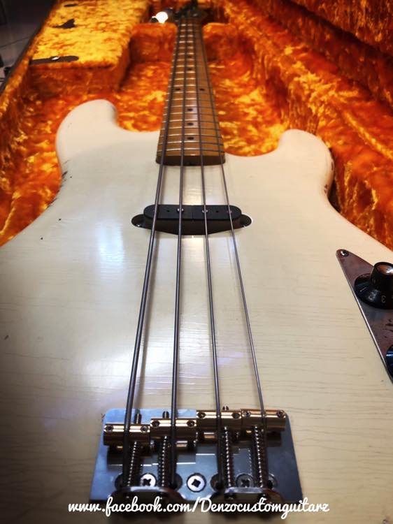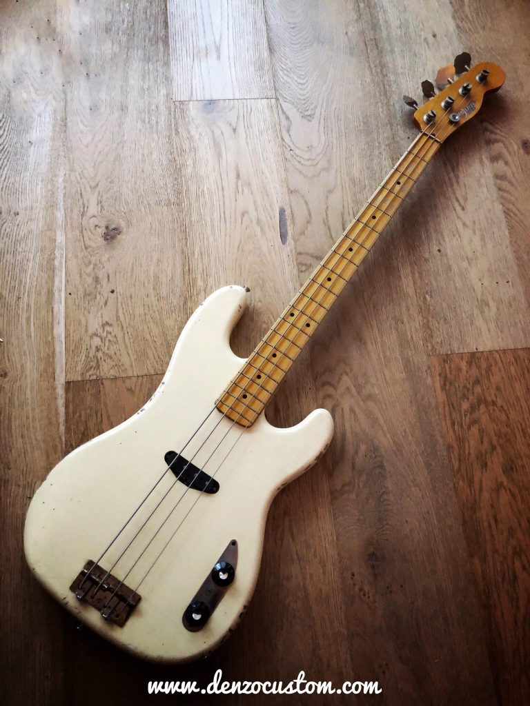 Lorsque Denzo publie les photos de sa dernière basse : c’est le coup de foudre immédiat ! Une revisite de la Precision Bass ’51, sans pick guard, dans une finition relic blanche à tomber par terre !