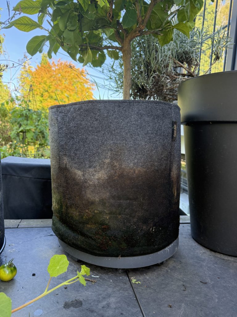 C’est d’abord pour cette raison que j’ai opté pour des pots géotextiles. L’aspect drainant m’a convaincu et, de fait, c’est un vrai avantage à l’extérieur.