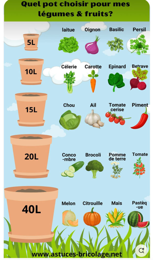 Parmi les cultures qui se prêtent bien à la culture en pot, voici une petite infographie qui vous indique environ la dimension nécessaire à l’épanouissement de votre variété préférée :