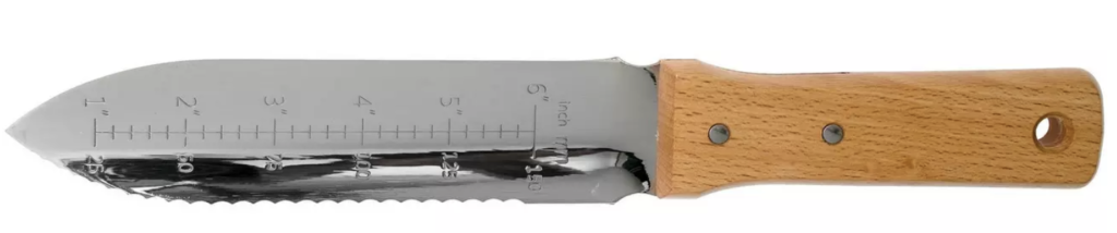 Le Hori Hori, c’est l’arme ultime au jardin : couteau denté d’un côté, incurvé dans l’autre sens pour former une mini pelle et plantoir gradué. Je m’en sers toute la saison pour pelleter, planter, repiquer, désherber, trancher et même récolter ! Il m’a encore bien servi pour l’opération bulbes 2026 🥷